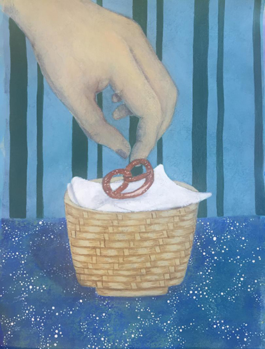 This is a painting based on an image that I woke up to last summer. The cup is a Chinese gaiwan, which is a bowl that is also a cup used for tea. In the image, I saw a cup that was also a basket made of bamboo. I watched as a cloth white napkin was folded and placed in the cup/basket. Afterwards, a hand presented a pretzel. It was placed on top of the napkin and presented perfectly.